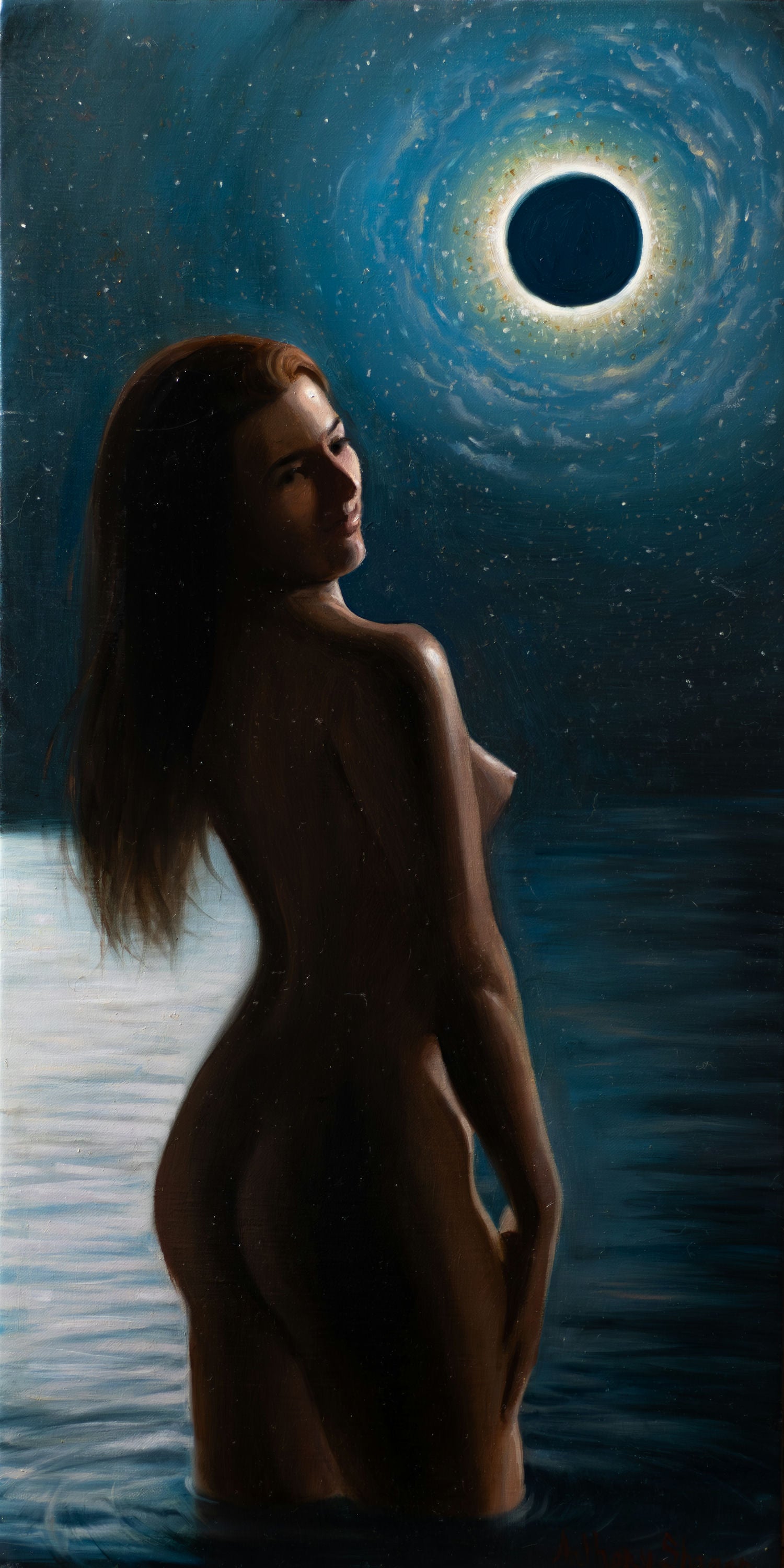 A woman standing in a calm, dark body of water with a look of warmth in her eyes.
