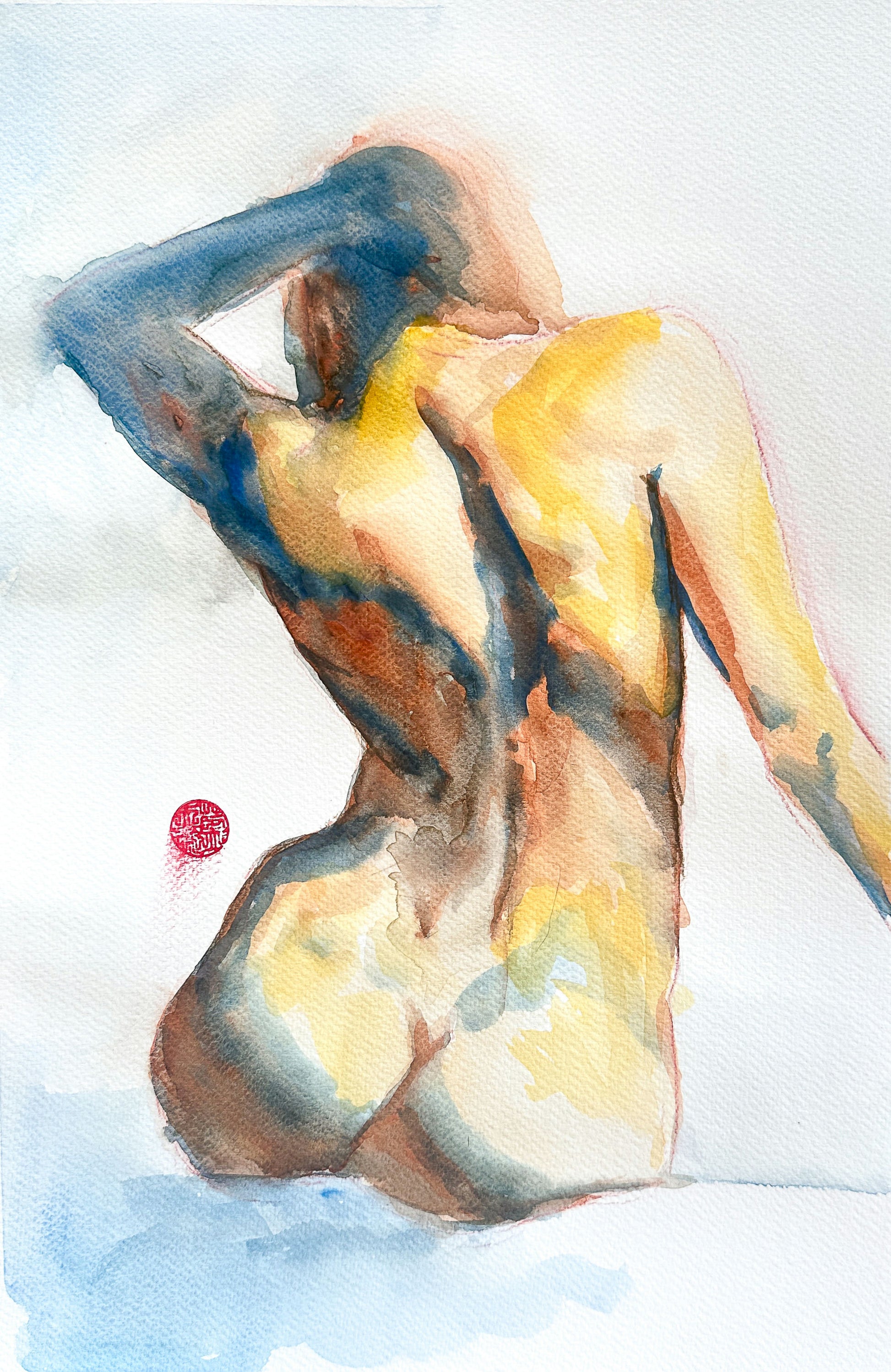 One of her recent pieces depicting the magnetic energy of the empowered feminine, celebrating sexuality, color, and an unapologetic love of the female form. "Bloom" explores watercolor’s organic behavior, layering controlled figurative technique with pooling water and pigment on untaped paper. The spontaneous pigment “blooms” balance control and surrender, celebrating the female form through both gesture and process.