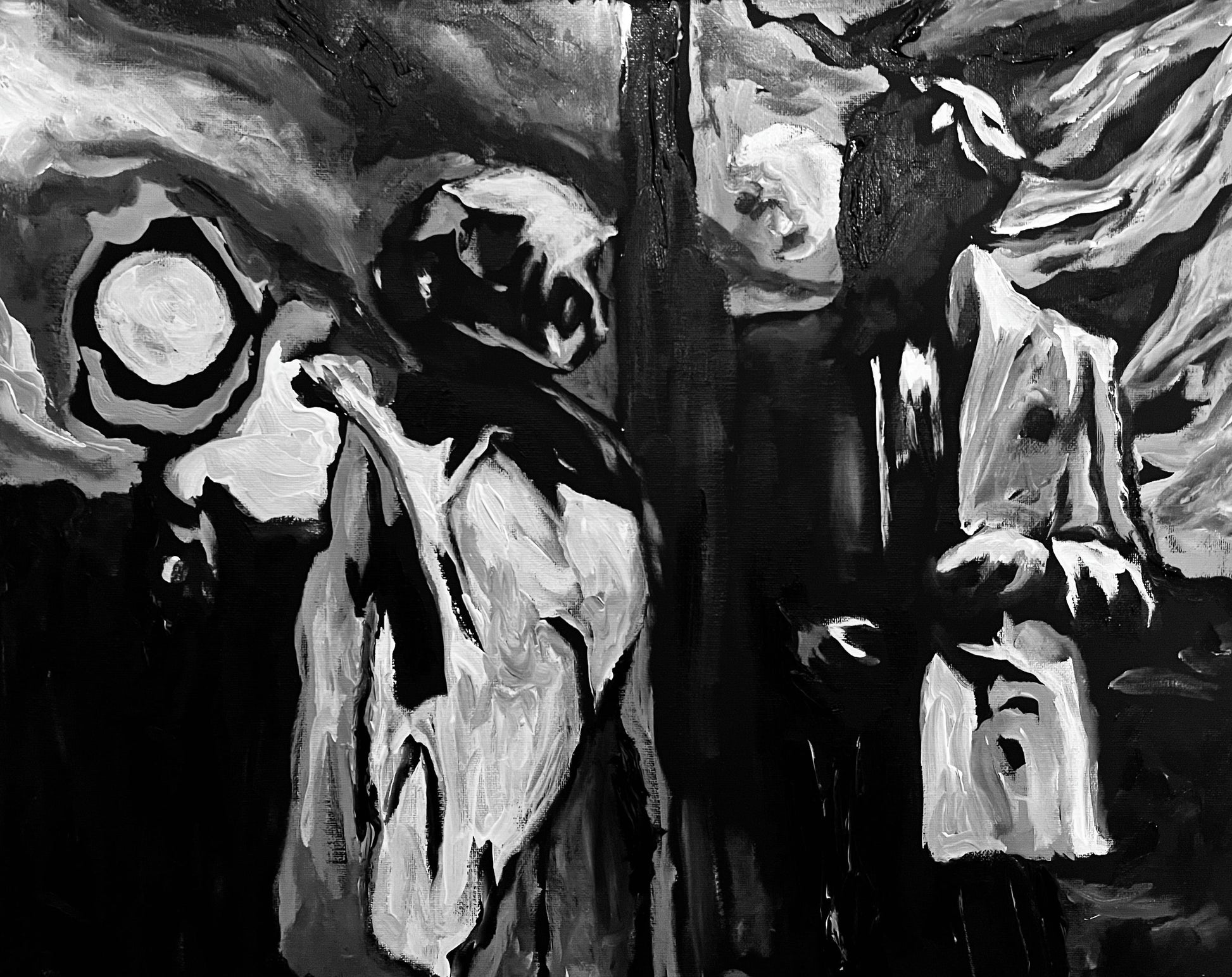 The image is a black and white abstract painting featuring two figures standing side by side: