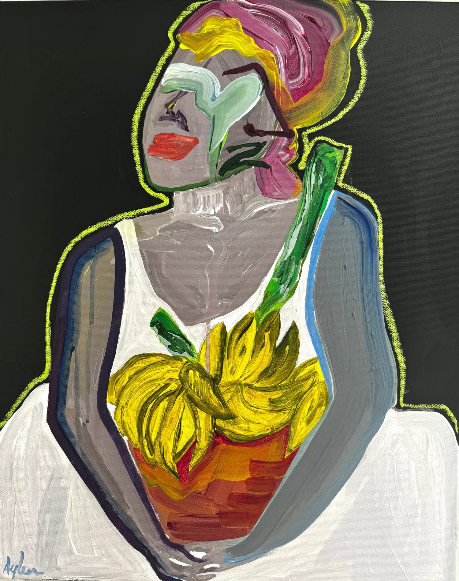 In Fruitful Conversations, I used color to express the tension between composure and interior intensity. Her body, painted in cool and calm tones, contrasts with the vivid, expressive color of her face and mind. This opposition reveals the difference between how she presents herself during conversation and what she’s actually thinking and feeling. On the right side, a second, almost hidden face emerges—an internal self with sharper features—suggesting that even in a “fruitful” exchange, she is exercising restraint in what she shares. The basket of bananas adds another layer of symbolism: representing both the fruits of her labor and her fertility—two aspects of a woman’s life that don’t always coexist in harmony.