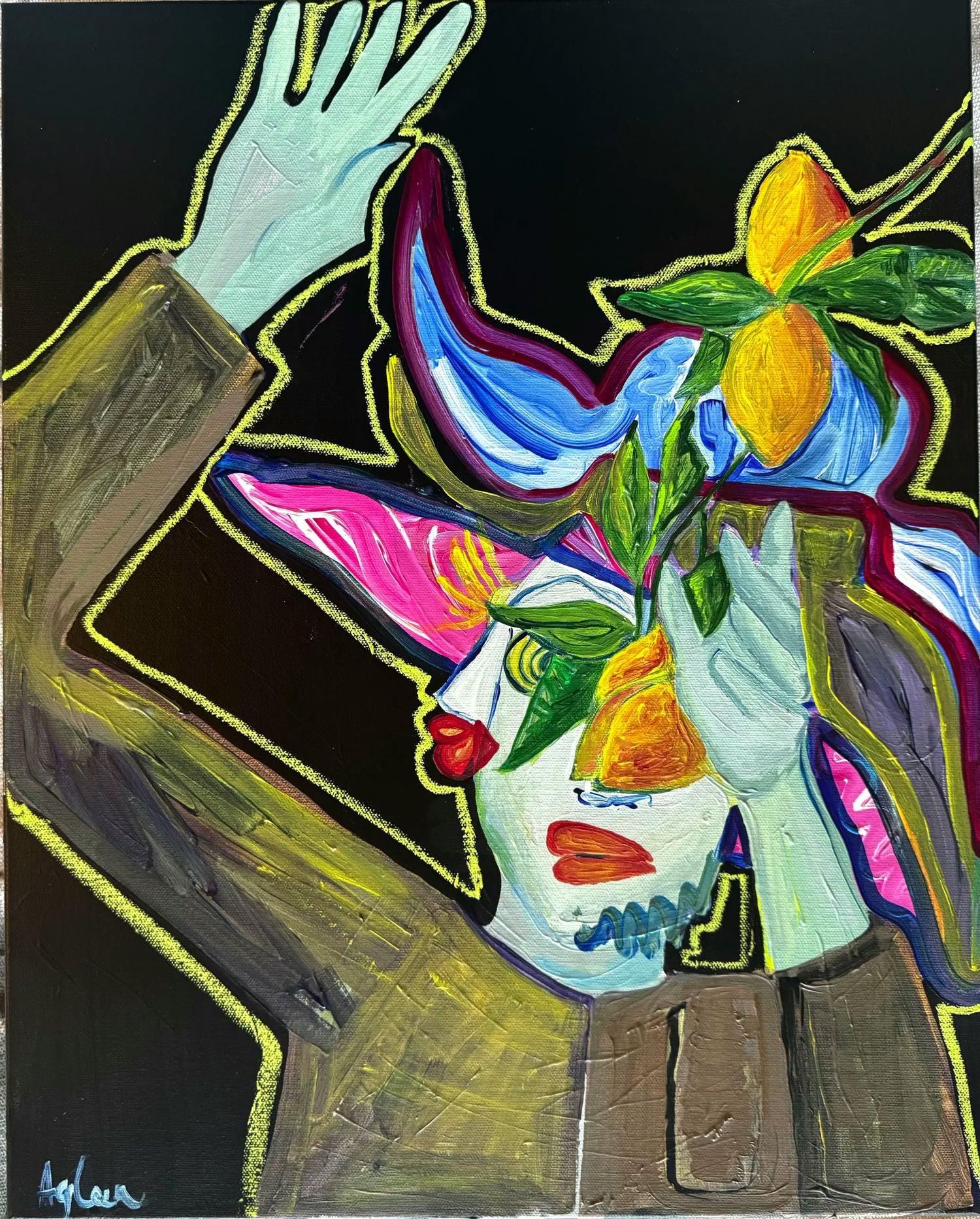 In Fruitful Conversations, I used color to express the tension between composure and interior intensity. Her body, painted in cool and calm tones, contrasts with the vivid, expressive color of her face and mind. This opposition reveals the difference between how she presents herself during conversation and what she’s actually thinking and feeling. On the right side, a second, almost hidden face emerges—an internal self with sharper features—suggesting that even in a “fruitful” exchange, she is exercising restraint in what she shares. The basket of bananas adds another layer of symbolism: representing both the fruits of her labor and her fertility—two aspects of a woman’s life that don’t always coexist in harmony.