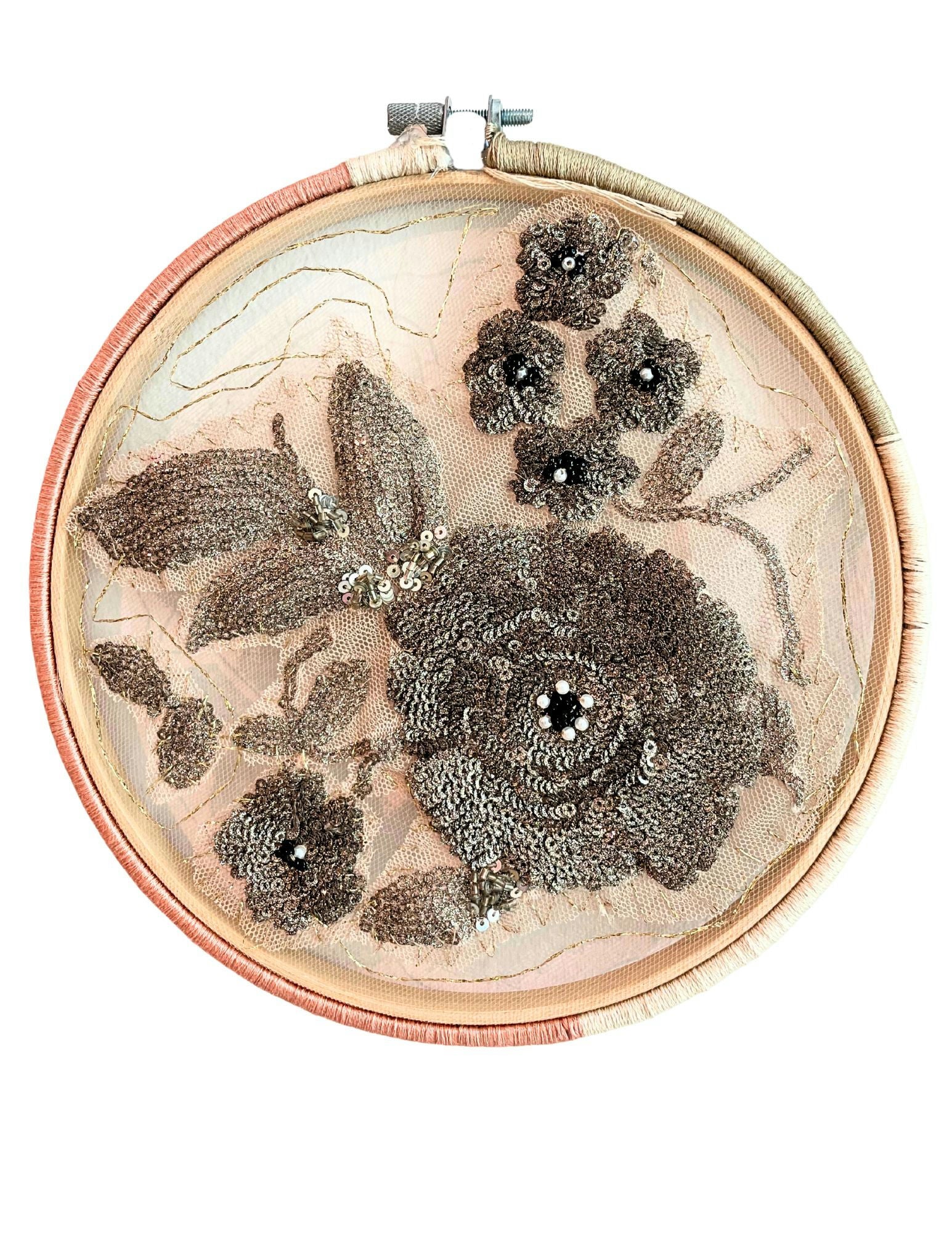 Hand-beaded and hand-embroidered, this unique lace, tulle, and upcycled materials fiber art is stretched in a ready to hang sustainably sourced bamboo hoop.
