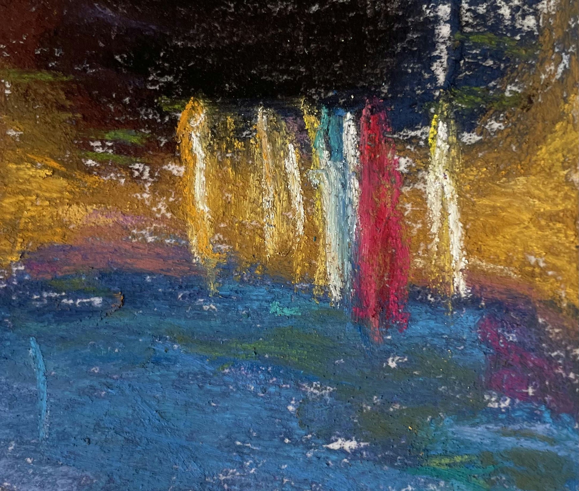 This painting is based on a photo I took with my iPhone when my friends and I were 18, walking the streets on carefree nights out. It captures a sense of nostalgia. A time when we didn’t have a car, didn’t have many worries, and felt completely free. It reflects that in-between stage, the transition from childhood to adulthood, when everything felt wide open and full of possibility.