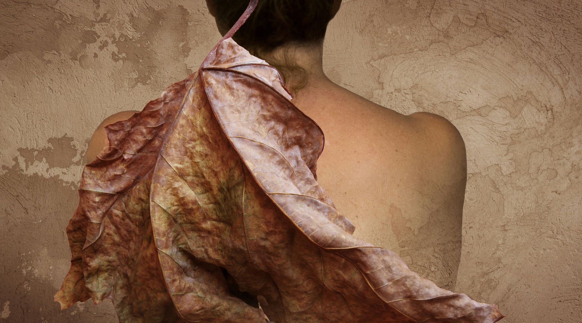 Leaf, from the Embedded Series. In this series, the word 'embedded' refers to having a sense of place. It is the feeling of belonging to or being deeply rooted in the land or society, of having a context. These self-portraits reveal how the elements of the environment have become incorporated into my body and into my identity, my sense of self. In this image, I am hiding, cloaked by a fallen leaf.