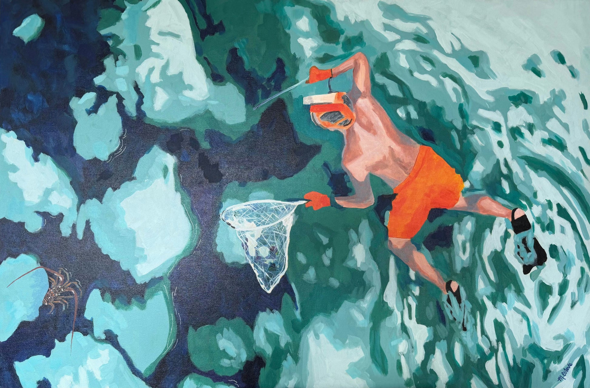 Expressive painting of a man snorkeling over rocks with a lobster tickle stick and a net. There us a lobster peeking out from the rocks
