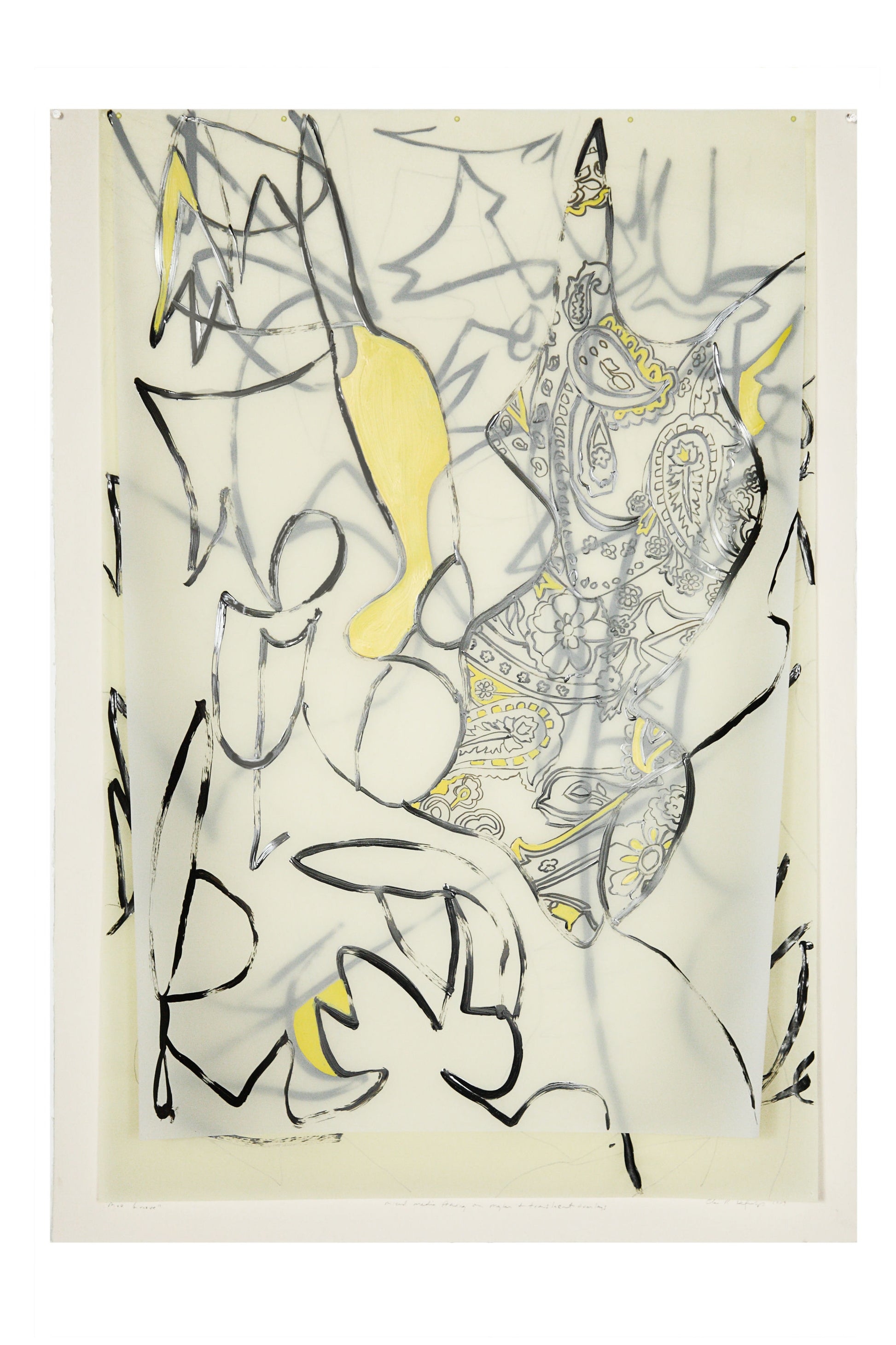 This is a layered piece which originated from me adding mylar onto one of my paints before I added paint. I wanted to preserve the line. I then used acrylic paint on the mylar and added a layer of translucent paper. Then I layered both the mylar and translucent paper onto a drawing I created on Arches Hot Press Watercolor Paper. I was interested in the ethereal qualities of the lines and the materials.