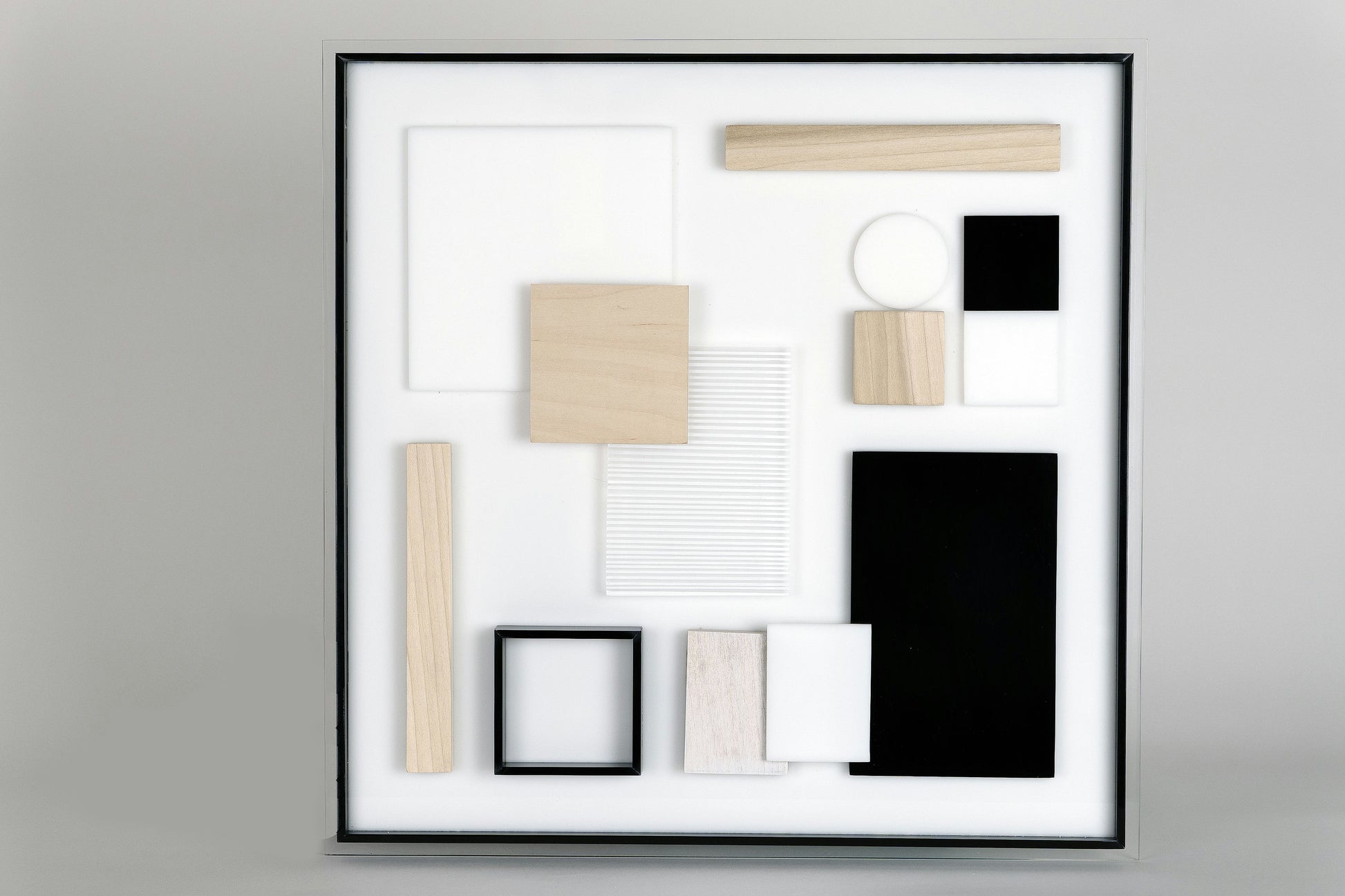 This diptych presents a refined abstract composition of geometric forms arranged in layered relief, combining natural wood, translucent acrylic, and deep black elements within crisp white fields. The work explores balance, duality, and spatial logic through a precise architectural rhythm, inviting the viewer to experience subtle shifts between opacity, transparency, weight, and light.