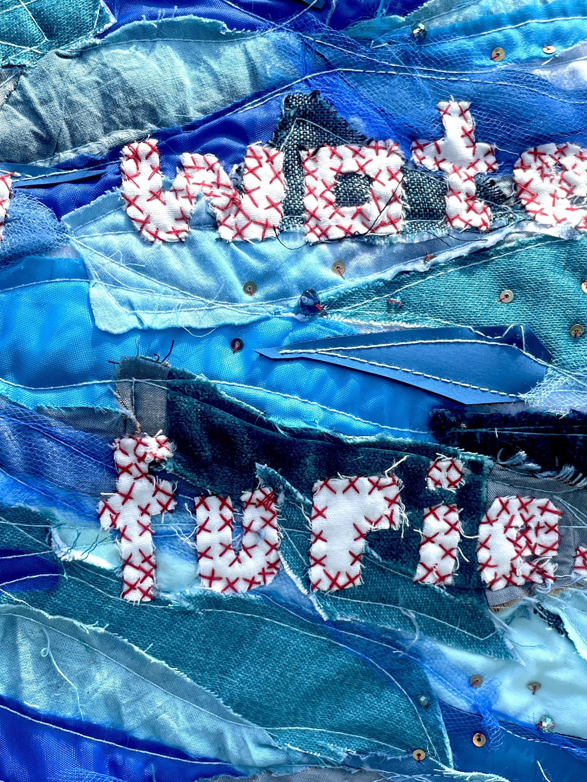 Quench Their Furies, takes an excerpt from the Ancient Greek comedy Lysistrata and re-contextualizes it with a more biographical lens of female strenght . Water has always been a sign of femme softness, graceful power, and transition for the artist. The piece is inspired by this powerful symbol and the delicate cross stitching the artist's grandmother used to do, often stitching biblical verses and landscapes. She was a steady force, and her true power lied in her ability to address conflict with kindness. The materials that compose this patchwork ocean current are fully upcycled from women's clothing, scraps, petticoat tulle, and discarded interior design swatches and beaded with vintage upcycled beads and sequins.