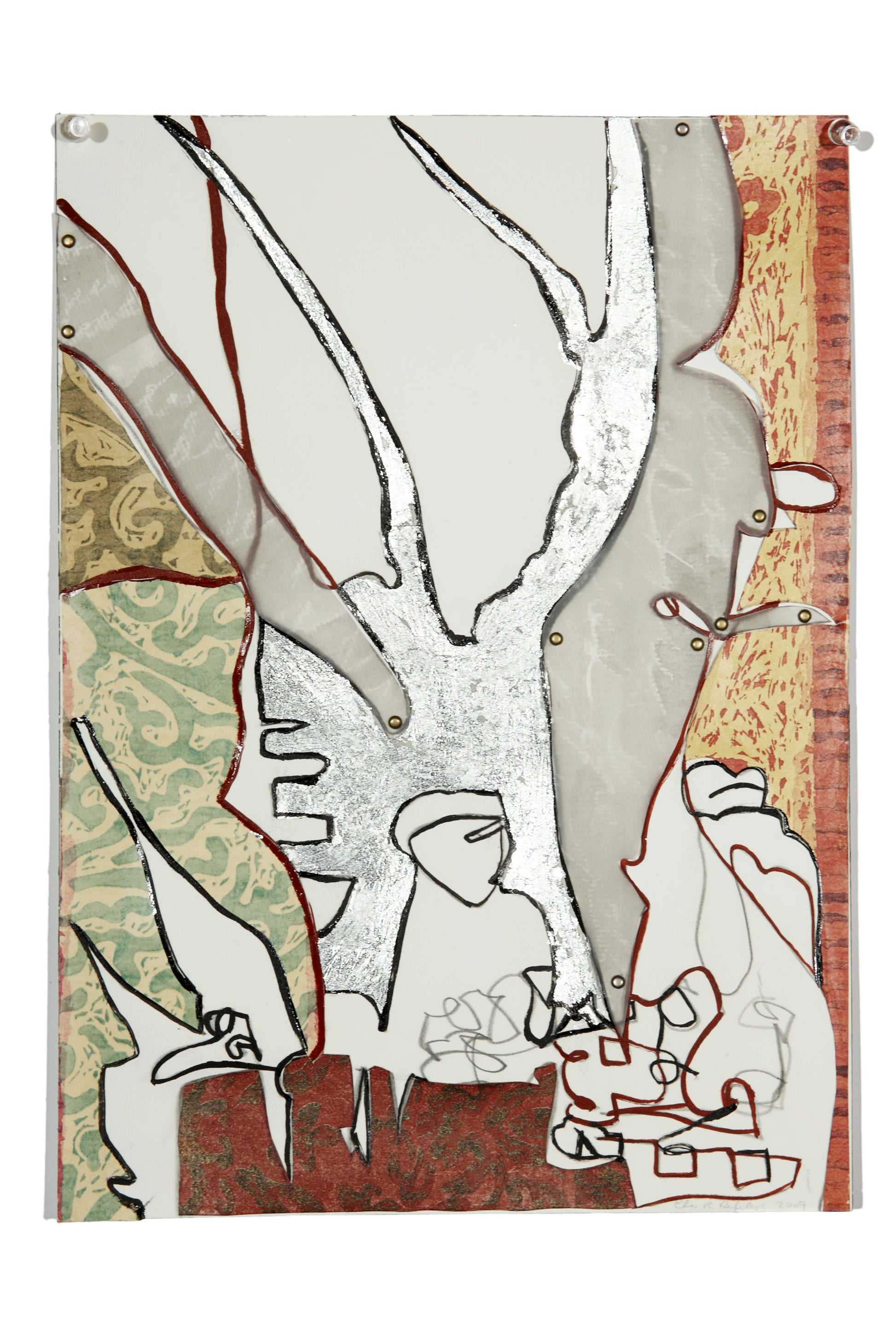 I started with a blind contour drawing at a park of a tree and figure at a table. I used acrylic paint & ink, then I collaged wallpaper in some areas and added silver leaf in the tree form.