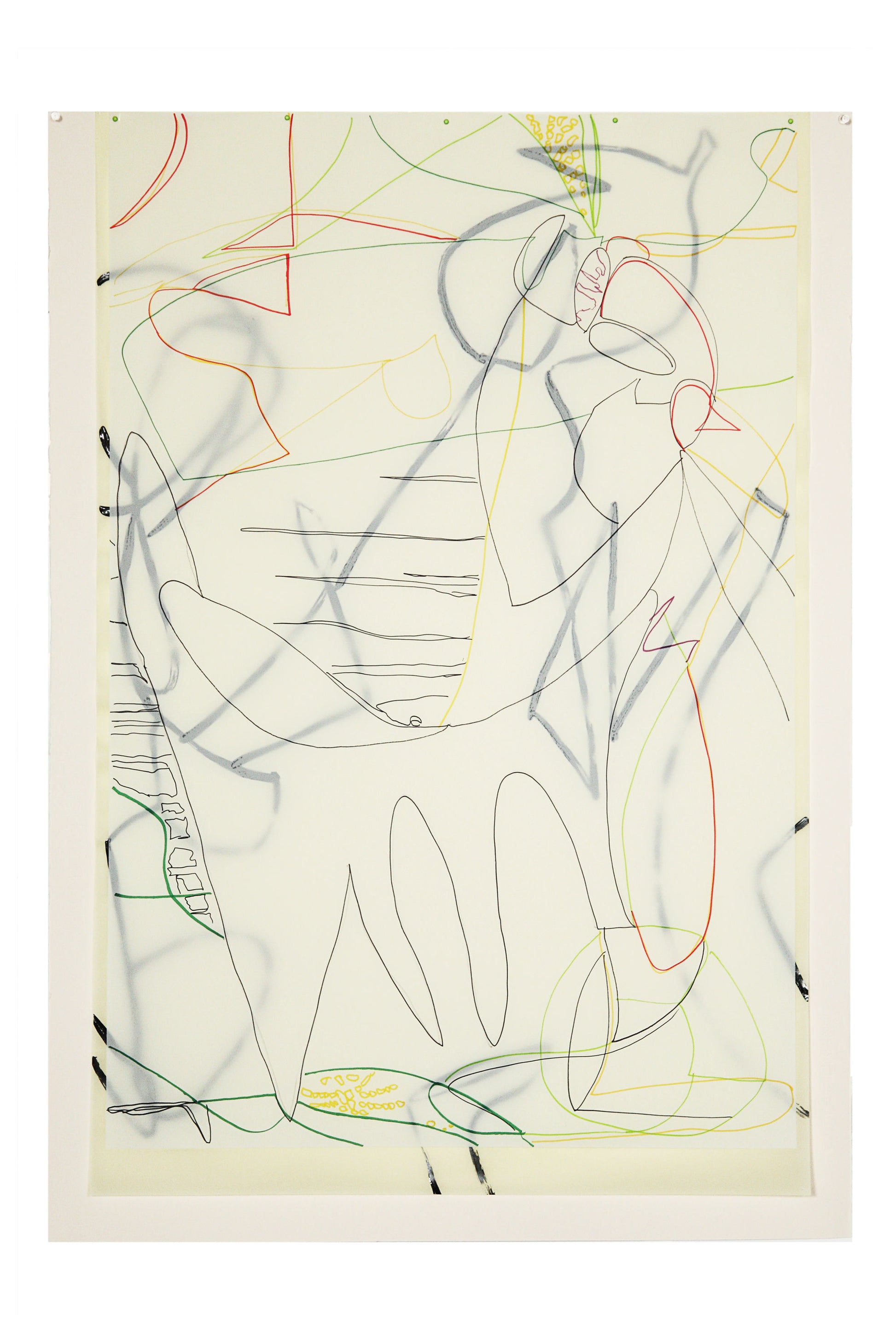 This is a layered piece which originated from me adding mylar onto one of my paints before I added paint. I wanted to preserve the line. I then used acrylic paint on the mylar and added a layer of translucent paper. Then I layered both the mylar and translucent paper onto a drawing I created on Arches Hot Press Watercolor Paper. I was interested in the ethereal qualities of the lines and the materials.