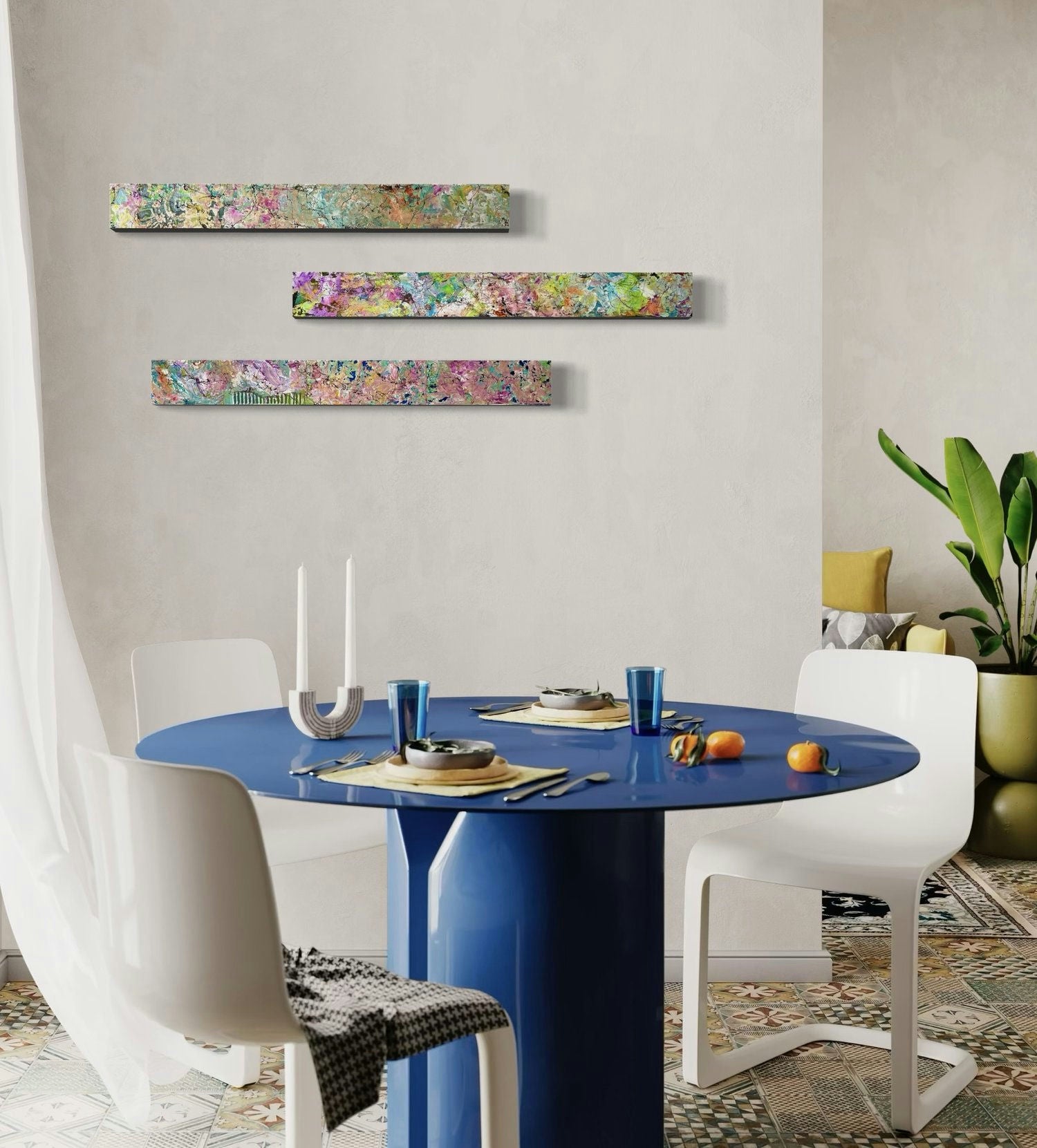 Despite the non-representational approach, the piece radiates a floral, almost garden-like atmosphere — capturing the essence of wild blooms through abstraction. The narrow format gives it a totemic, architectural presence, inviting the viewer to read each panel individually while still experiencing the harmony of the set.