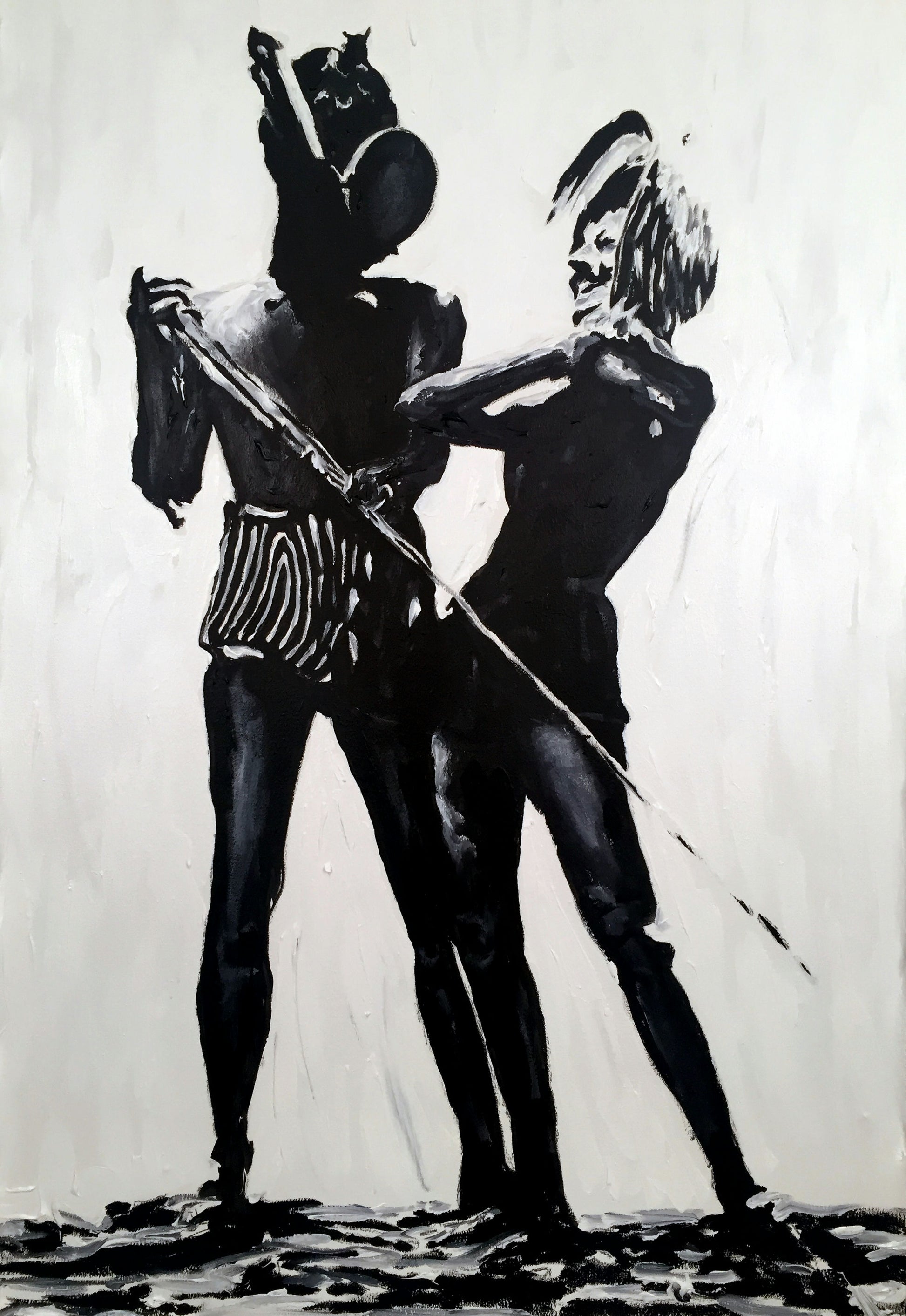 Male and female figures gazing at one another. Inspired by 1940's imagery and is metaphorical for the stereotype role of male and female related to relationships, sex, and pursuit.