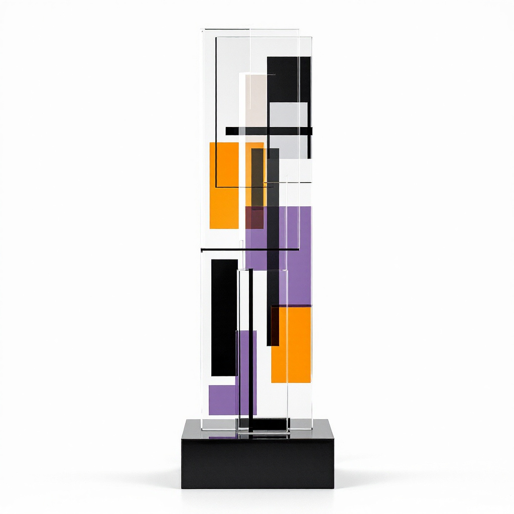 A tall, minimalist sculpture made of layered transparent acrylic panels features intersecting geometric shapes in black, white, orange, and purple. Mounted on a black base, the composition creates depth and optical complexity through overlapping planes and precise linear structure.
