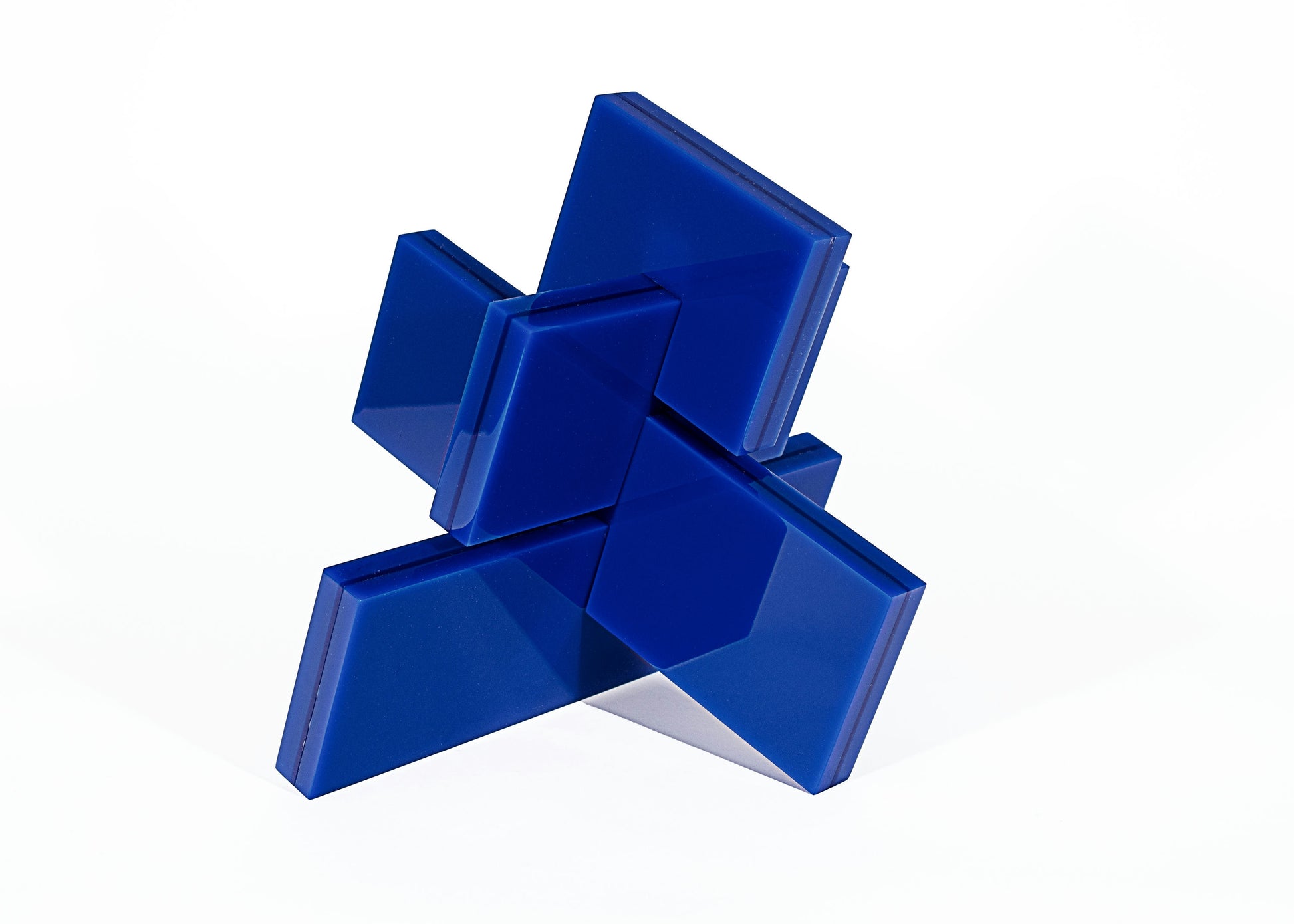A composition of intersecting blue acrylic planes forms a precise yet dynamic geometric structure. The translucent surfaces capture and reflect light, creating layered depths and shifting tonal variations. Balancing symmetry and movement, the sculpture transforms minimal geometry into an exploration of spatial rhythm and luminous tension.