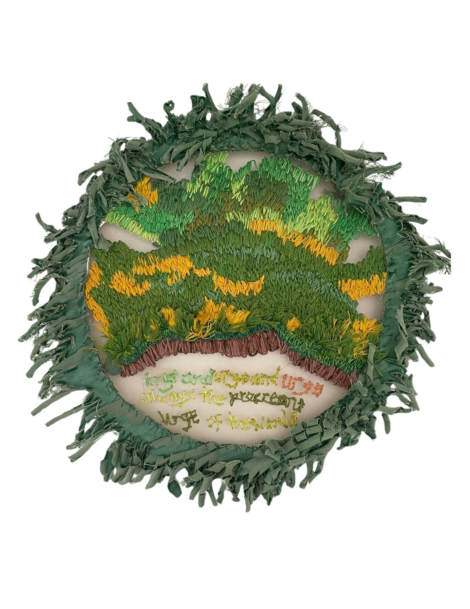 Medium: Made entirely of upcycled mixed materials including design scraps and vintage embroidery floss in a bamboo hoop.