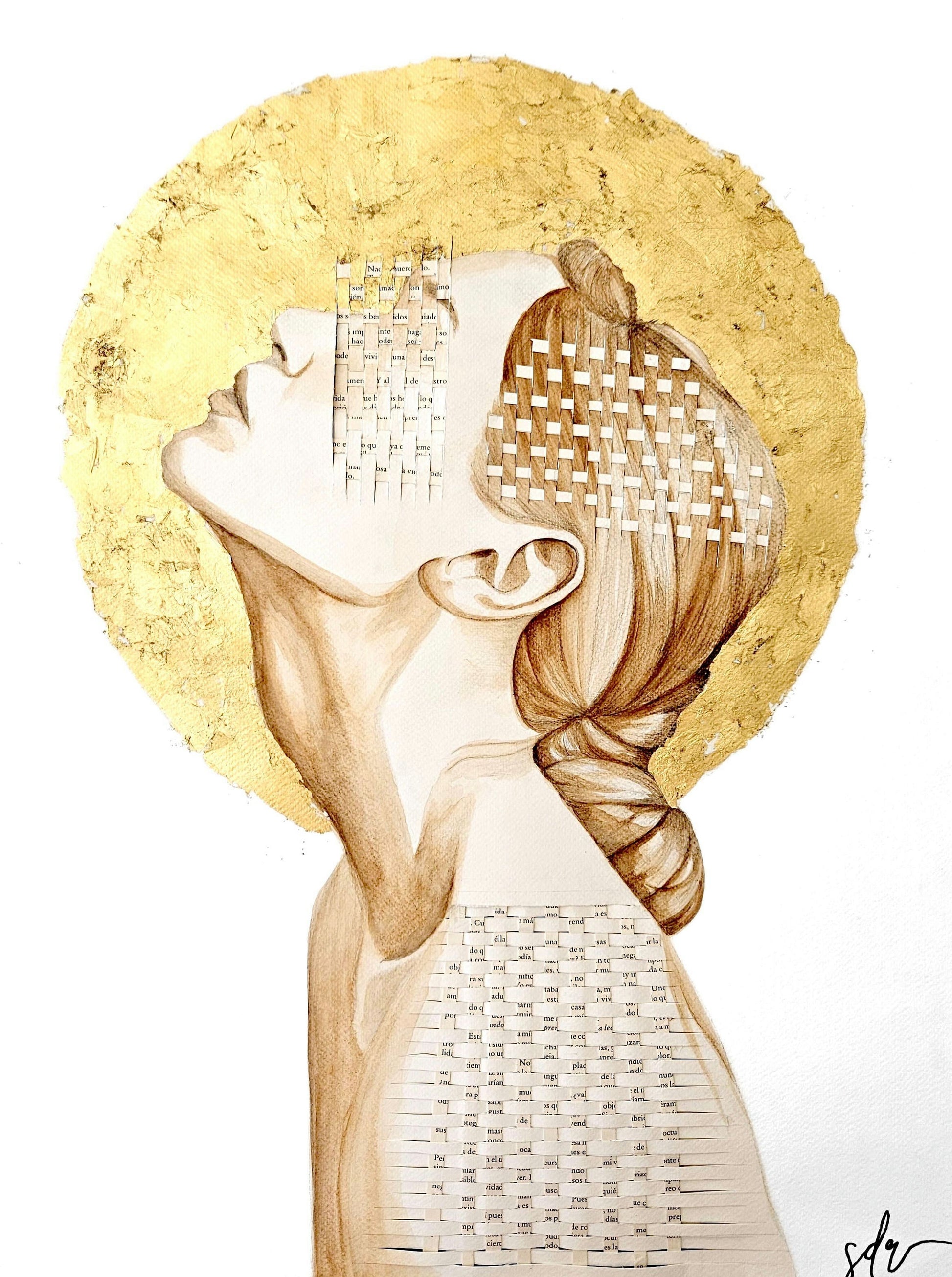 In 2024, del Rivero lost her mom right after welcoming her first child, leaving her to contemplate themes of life and death. In the wake of her grieving, her aunt gifted her a book by Elisabeth Kubler-Ross called “The Wheel of Life: A Memoir of Living and Dying.” Kubler-Ross not only teaches how to die well but also offers a lesson on how to live well. In this art piece one can find actual pages from the memoir, specifically those that uplifted and spoke to the artist. While the text is not legible, at the very top one can catch a glimpse of “Nadie muere solo” which in Spanish means “no one dies alone.” The image is one of strength, resilience, power, depth, hope, peace, and solace.